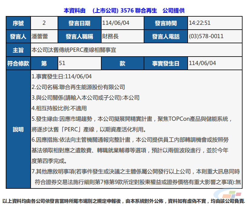 6月4日,中国台湾光伏制造企业联合再生能源股份有限公司发布了“关于淘汰传统PERC产线相关事宜”的公告。 联合再生能源称,此次战略调整旨在响应光伏技术迭代潮流,通过实施 “精实计划”,将资源集中于更具发展潜力的TOPCon产品以及储能系统业务,逐步淘汰传统PERC产线,以期资产活化利用。 资料显示,联合再生能源股份有限公司(原名:新日光能源科技股份有限公司)是一家台湾上市公司,2018年10月,该公司由新日光、昱晶能源和升阳光电三家公司组合成立,主要从事制造及销售太阳能电池及组件业务,产品主要包括单晶硅太阳能电池及多晶硅太阳能电池。 来源:数字新能源DNE整理杠杆炒股如何理财 |